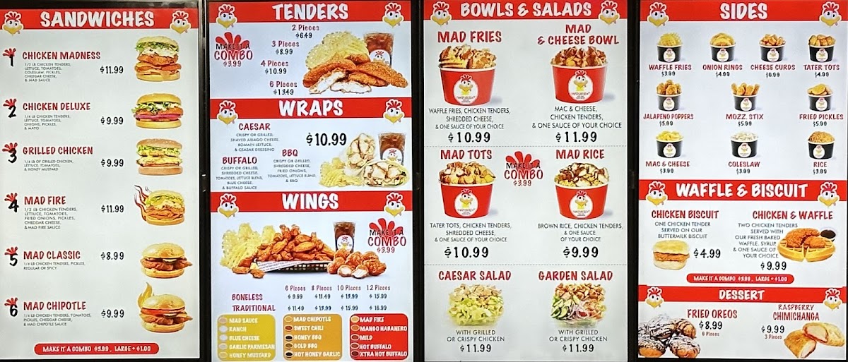 Introducing the menu at Mad Chicken - Glen Cove, where crispy, flavorful chicken takes center stage. Nestled in the heart of Glen Cove, this restaurant serves a lineup of delectable chicken wraps, including the BBQ Wrap, Buffalo Wrap, and Caesar Wrap, each priced at $13.74. Diners rave about the perfectly cooked chicken tenders, whether grilled or fried, packed with flavor.